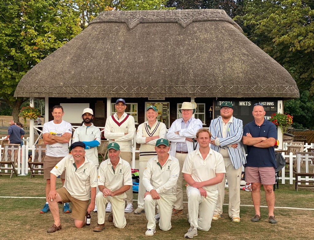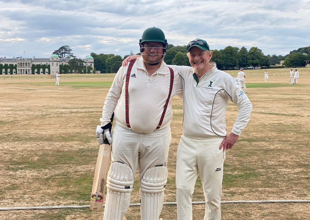 Although not in those original proto-laws (or maybe it is), the unwritten rule on these occasions is that no toss is made and Goodwood always bowl first – allowing their skipper to get the burgers on the barbeque in good time for the post-match ‘snap’. Faced by a seemingly endless procession of top-notch bowlers – left arm in dippers, right arm off cutters, off breaks and googlies – aided through the air by the humid conditions – our innings flattered to deceive with most getting a start but few ‘going on’. – Sepia, (25 retired), Rishi (18,) skip (16), Kendall (16), and Danger (16 not out) all got into double figures. Despite some watchful batting and excellent running by our guest for the day George at the close of our innings we ended on 111 for 6 – probably 20-30 below par we felt – especially with one fielder short and a batter-friendly outfield.