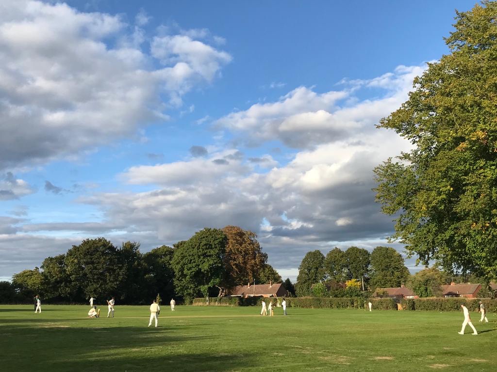 The last game of the season is a bittersweet thing. At Droxford, the last swallows were jinking about in the declining Hampshire sun – “thinking about their holidays”, as Jolly put it. The leaves on the many trees ringing the ground – and indeed on those standing within the boundary – looked as if they were thinking about having a little rest on the Hampshire turf. And the sun was starting to lose its battle with the chill, which could be distinctly felt on the Hampshire breeze. Jumpers were in evidence as The Racqueteers took to the field.