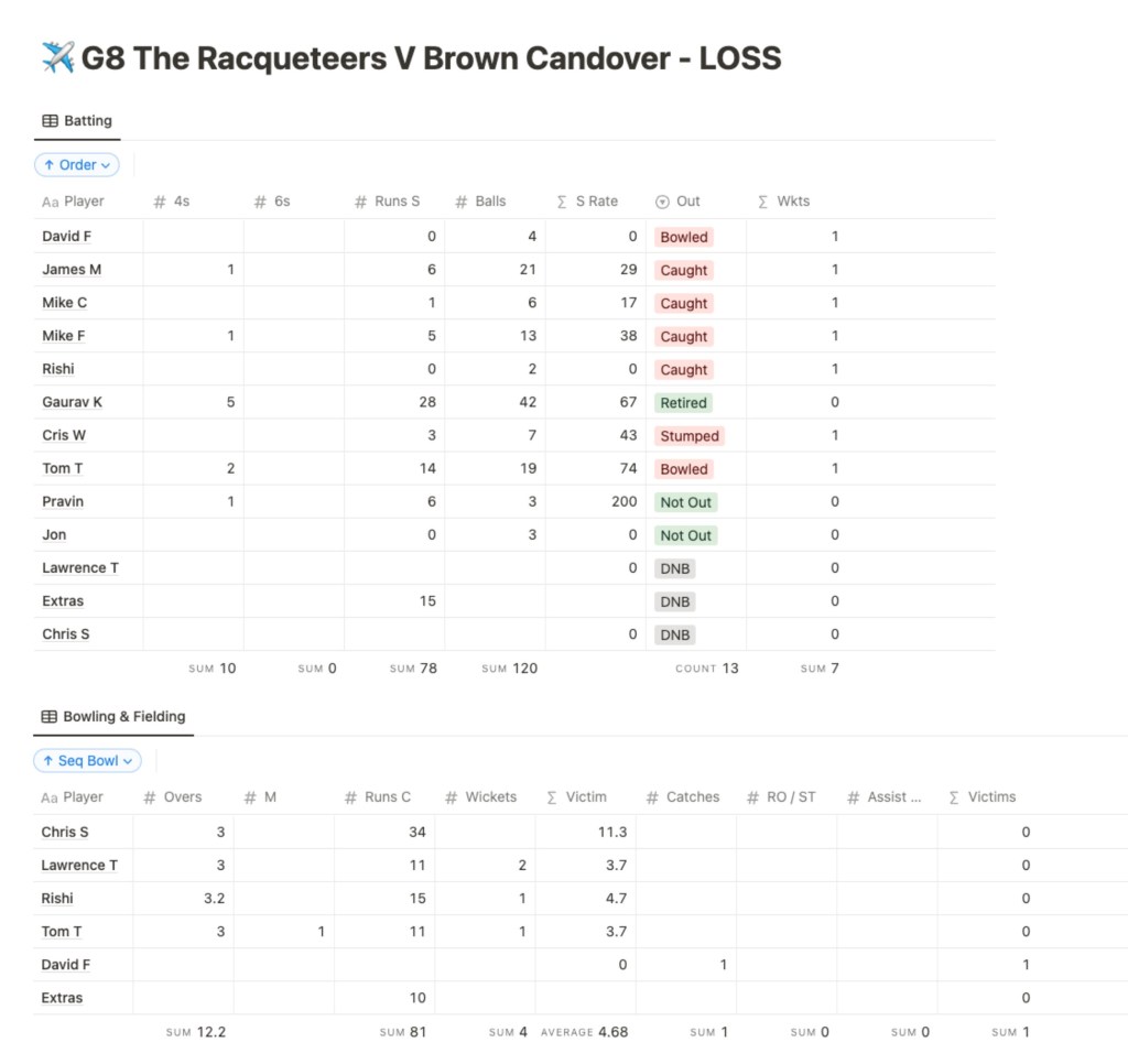 Brown Candover probably expected an easy win. It was not as easy as all that, however, due to a display of bowling from the Racqueteers that was as confident as our batting had been uncertain. Head of Salmon in particular focused and probed his way to figures of 3 for eleven (off 3 overs), while Tom Talks and Rishi both troubled the opposition with accuracy, pace and some movement. There was a moment I think when some of us wondered if a remarkable comeback was possible, but the Candover men know their ground well, and they know how to find the boundaries, and in the end it was a comfortable win for them.