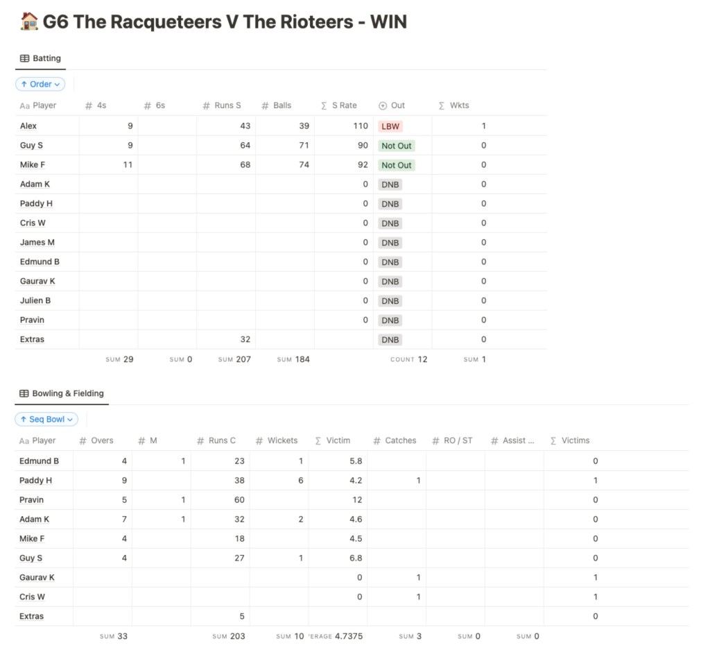 It didn’t seem to put off the Rioteers. Sepia broke through with the second ball of the match – a deceptively loopy delivery that, well, completely deceived their opening bat. But they recovered well, posting a highly defensible total of 207, including 57 from their number-four bat. It was a good score for the wicket on the day: a fairly flat track but without much life in it. Stuart Broad would probably have called it ‘soulless’. The extras rate was not high, but then neither was the grass in the outfield – the Rioteers seemed to find the boundary fairly easily. Paddy Holmes took the lion’s share of our wickets: he got a well-deserved six for 38, including three bowled, while Adam ‘Benefit of Mr’ Kite took two.