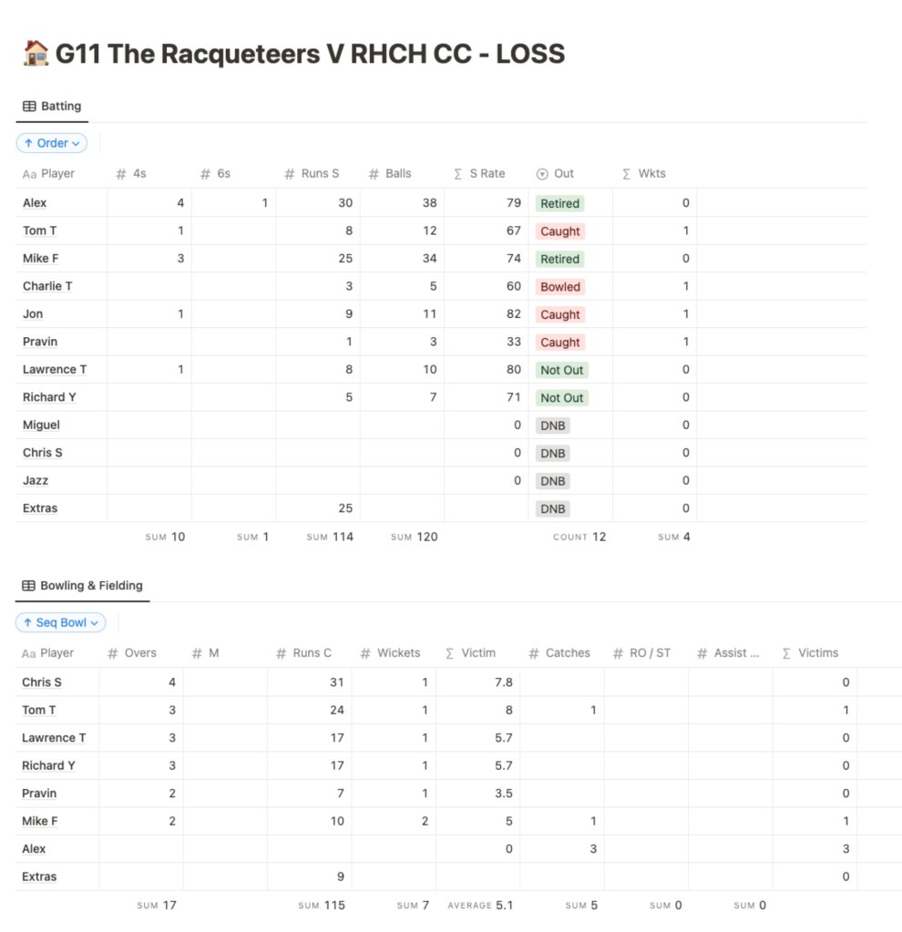 Whilst the middle order stumbled a little and wickets were lost, good attractive play from Jolly (9) and a late rally from both Prav and Yox saw a total of 114 posted.