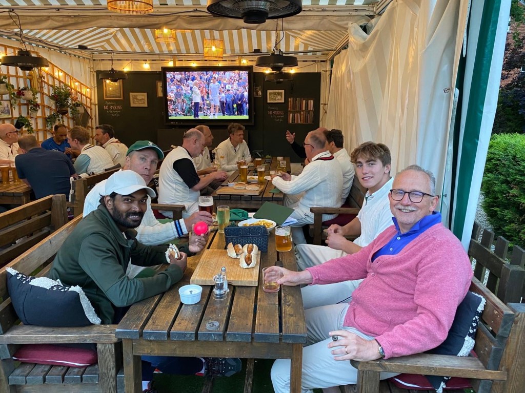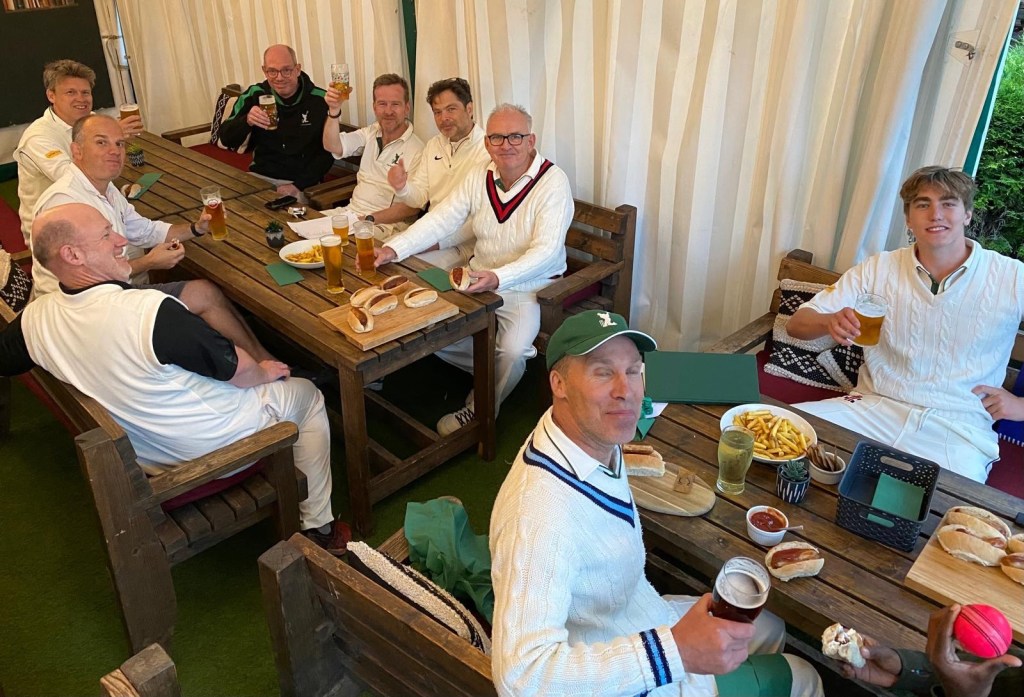 At first, things did not quite go our way. Their opening batsman made a commanding 35. The last of those runs came when he returned to bat after retiring at his 25-run limit – but to say that rather gives away the ending. After his departure, wickets fell steadily and, with the exception of their number four, who retired on 26, cheaply. Head of Trout (2 for 24) struck twice – one wicket bowled, the other caught nimbly at mid-off by his own son. Rishi (0 for 18) bowled ferociously, but not wildly, and was unlucky not to claim a wicket. Tom Talks’ (0 for 11) recent adventures in southeast Asia had clearly added some chilli to his constitution, although his fast-medium also enjoyed less success than it deserved. The wickets mostly fell to Leo (4 for 10) and Aussie Stu (2 for 10). Leo repeatedly deployed an apparently unplayable wind-assisted in-swinging yorker, while Stu bamboozled with flight, finger-spin and the odd zinger. The President (9 for 1) cleaned up the tail.