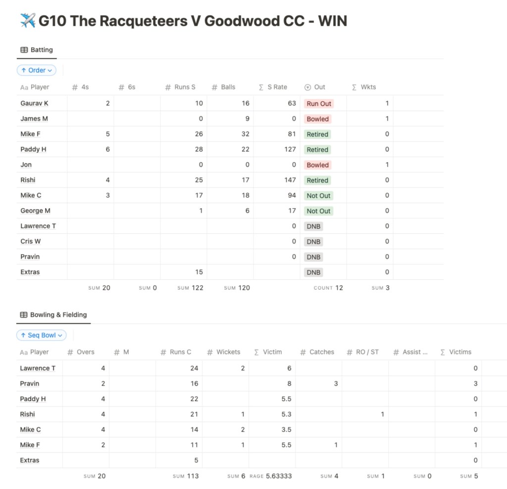 There was a certain amount of speed in Goodwood’s opening attack. And accuracy. G and the Bard, opened with more dot balls than they’d have liked. Mike F (26 not out), Paddy (28 not out) and Rishi (25 not out) started putting the runs on, however, comfortably reaching their limits and leaving Mike C (17 not out) with little to do, other than hitting a perfect cover drive to the boundary. We ran out of overs on 122 for 2.