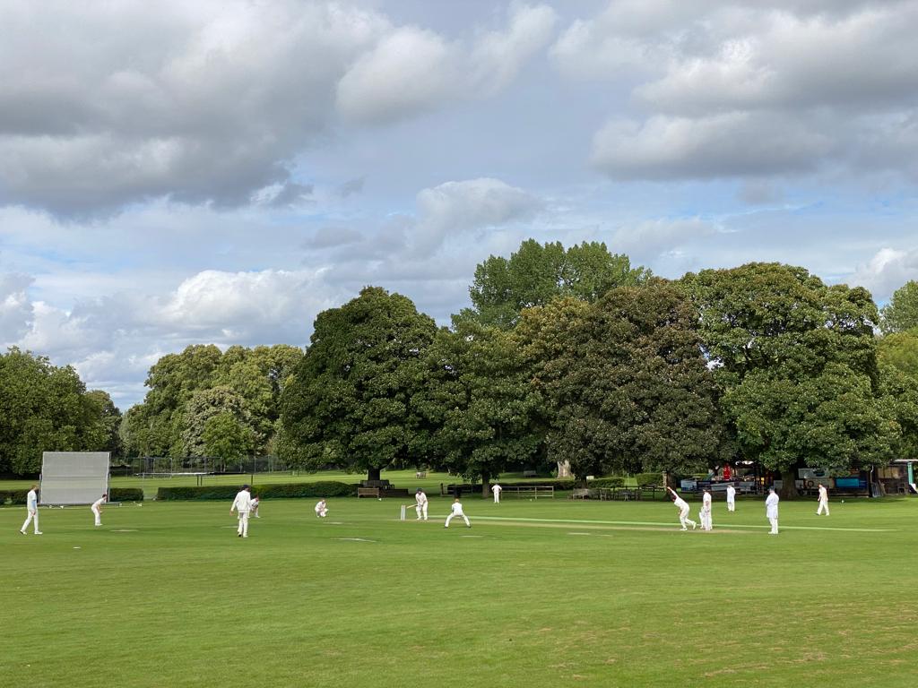 It’s always a pleasure to play at the old Royal Green Jackets ground against our old friends St Cross. The day was overcast but mild and the ground looked immaculate. St Cross won the toss and decided to bat. As usual they had a number of talented batsmen, especially in the middle order, and a fulsome total was likely. Initial indications were good as Tom T (8-1-14) The President (9-1-13) bowled tightly. St Cross then accelerated rapidly through a combination of their liking for Sepia’s slow left arm (5-0-54) and multiple edges through the slips off Rishi – who bowled with extreme pace (8-2-51). Charlie (4-0-40) and Skip (5-0-36) gamely tried to slow the run rate with some success. An event worthy of note was a super sharp piece of fielding when Jules (who alternated patrolling inside the boundary with riding Mike’s mod scooter round it) and Charlie T combined to run out the impressive number 3. St Cross finished on 240 for 5 – slightly less than last years’ total, but still a big ask.