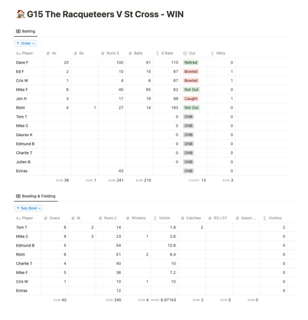 Racqueteers started well against two impressive teenage quicks, Ed (10) falling after breaking double figures for the first time for the club. Cris (4) looked solid and showed good technique for one so new to the game until he was beaten by one that nipped back at pace. Skip (40 not out) joined Dave (100 retired) for the defining partnership of the match. The later playing one of the great Racqueteers’ innings – exquisite stroke play that had even the opposition swooning. On Dave’s retirement (to great applause), Jon (17) took to the crease for the first time as a Racqueteer, looking very neat and tidy. Rishi (27 not out) then exploded and that was that, 241 off 34.1 overs. A really resounding victory built on a great team performance.