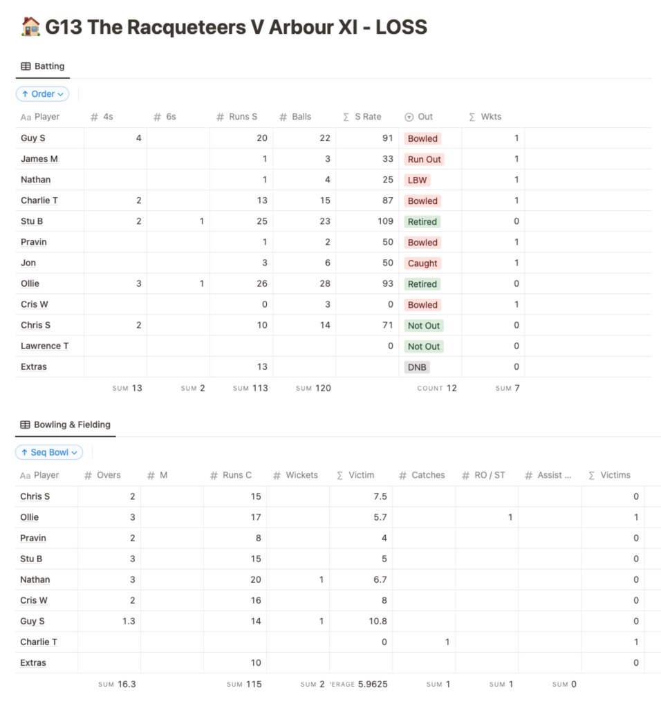 Guy opened the batting, posting a fluent 20 before being bowled. The Bard (1) and Nathan (1) having fallen quickly to a run out and LBW decision, Guy was paired chiefly by Charlie Talks (13) and Aussie Stu (25 not out) – the latter playing with his usual punchy Antipodean grace. As our other wickets tumbled, it was Ollie (26 not out) who helped us over the 100 mark, though honourable mention must be made of Jolly’s 3 and Farmer Chris’s good-looking 10 not out. Still, by the end of our 20 overs we had only reached 113 for 6, which did not feel like an easily defensible target.