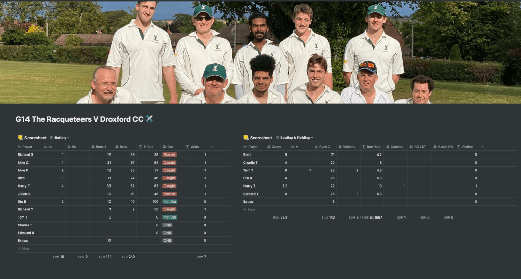 Ably supported, in the last few overs, by Jules (10) and Stu B with the same score, and a commendable 141 was posted in our 40 overs.