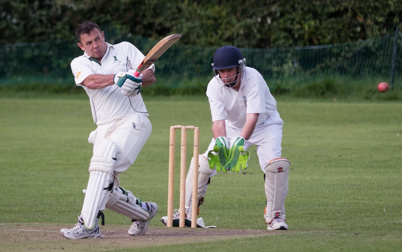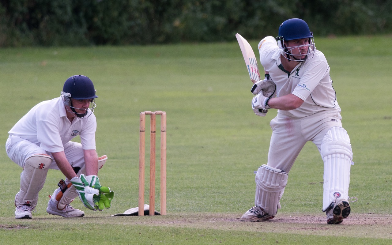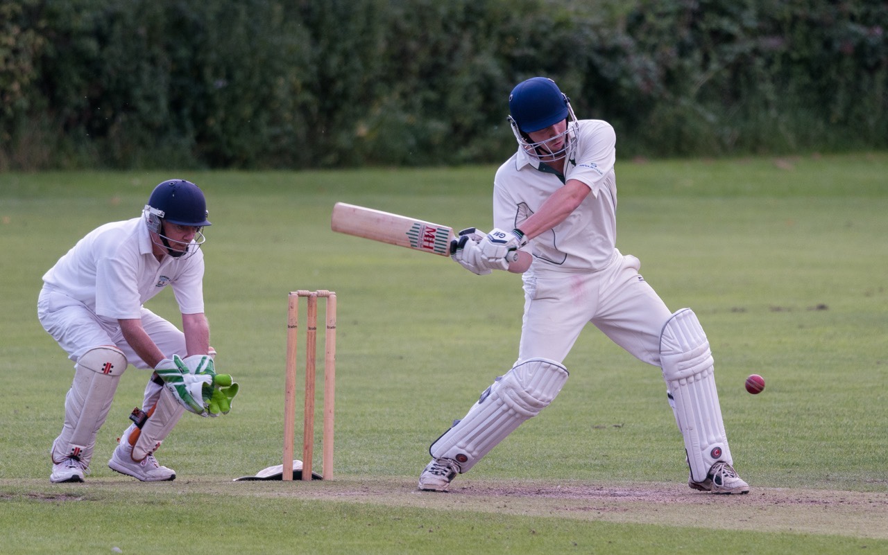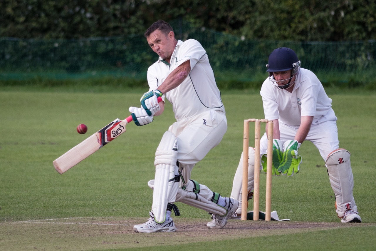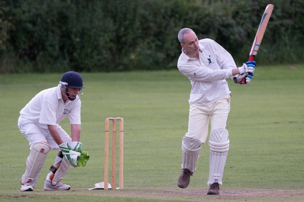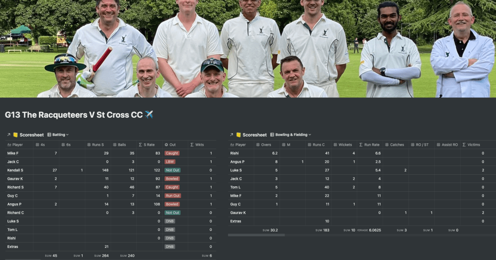 We played our first ever match against St Cross on a fabulous sunny afternoon, at a great ground surrounded by trees and meadows, with St Catherine’s Hill in the background. St Cross run six league teams, with their firsts currently standing second in the Premier division of the Southern Premier Cricket League. To be honest, I don’t think the first team would dare play us – too much to lose! As it was, we played their Sunday team, who were an enthusiastic and quality mix of experience and youth. The format was a a potentially gruelling 40 overs a side. Mike F won the toss and we batted. Mike F and Jack took the crease. Jack surprisingly fell lbw for 0 in the second over, a decision he wasn’t entirely happy with. Kendall came in at this point and – stayed in. The main story of our innings was Kendall hitting an unbeaten 148, including 27 fours and one six, and reaching the highest ever Racqueteers’ score. Mike F hit 29 (seven fours and one single) before being caught hitting high at mid wicket; Gaurav was bowled by an excellent ball for 11; Richard S scored an excellent 40 in a partnership of 93 with Kendall; Guy scored 1 in a partnership of 44; and Angus scored 14 before hitting out and being caught in the last over. But mainly the innings was about Kendall, only occasionally needing to wipe the sweat from his brow as he bludgeoned his way through 39 overs, facing 121 balls and accelerating in the second half but scoring fairly consistently throughout. Even running Guy out wasn’t enough to blot his copybook. The Racqueteers ended at 264 for six, a strong total, but still reachable in 40 overs.