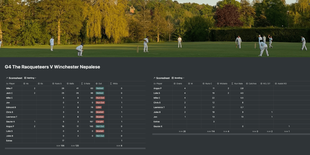 Fielding first on the soft, slow track we soon took control with ever-lively Danger clean bowling 2 for only 11 in his 4 overs and Racqueteers debutant Luke also picking up 2 for 18 in his 4 over spell. With some swift work behind the stumps from G and two excellent run outs from Jules & Luke and the Nepalese wickets continued to fall.