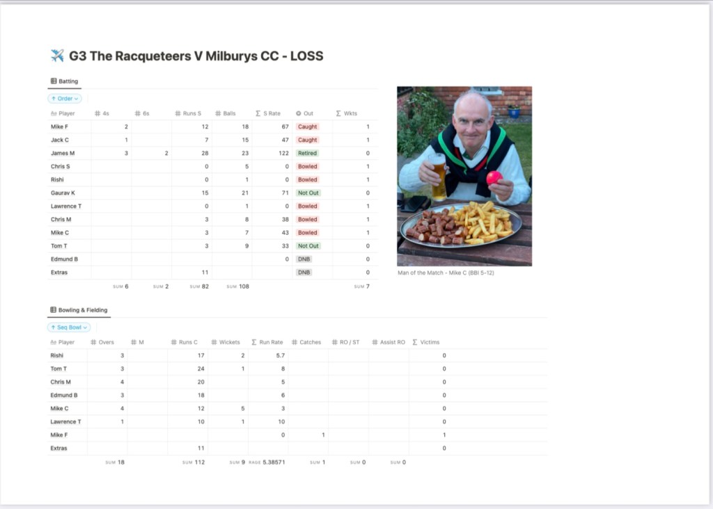 Losing the toss, we fielded first and The Milburys soon set about some aggressive batting with rather too many boundaries flowing for our liking! However, our opening bowlers Rishi & Tom T stuck to their task well returning 2 for 12 and 1 for 26 respectively. Bowling beautifully with good shape and swing – but without much luck – was Racqueteers debutant Chris M (aka The Doctor) whilst at the other end, the ever-wily Sepia tweaked three overs of controlled left-arm spin. When Sepia had to leave the field after cutting his finger in the field, our esteemed President took over the attack bowling up the hill. Having been cautious about bowling at all in this match (due to a nagging heel strain) he then delivered the most impressive spell of accurate, medium-paced bowling; a career best 5 for only 12 runs in 3.2 overs. Even more extraordinary was that all the dismissals were clean bowled. Well played Mike! Thus The Milburys innings finished on 112 for 9 in their 18 overs.