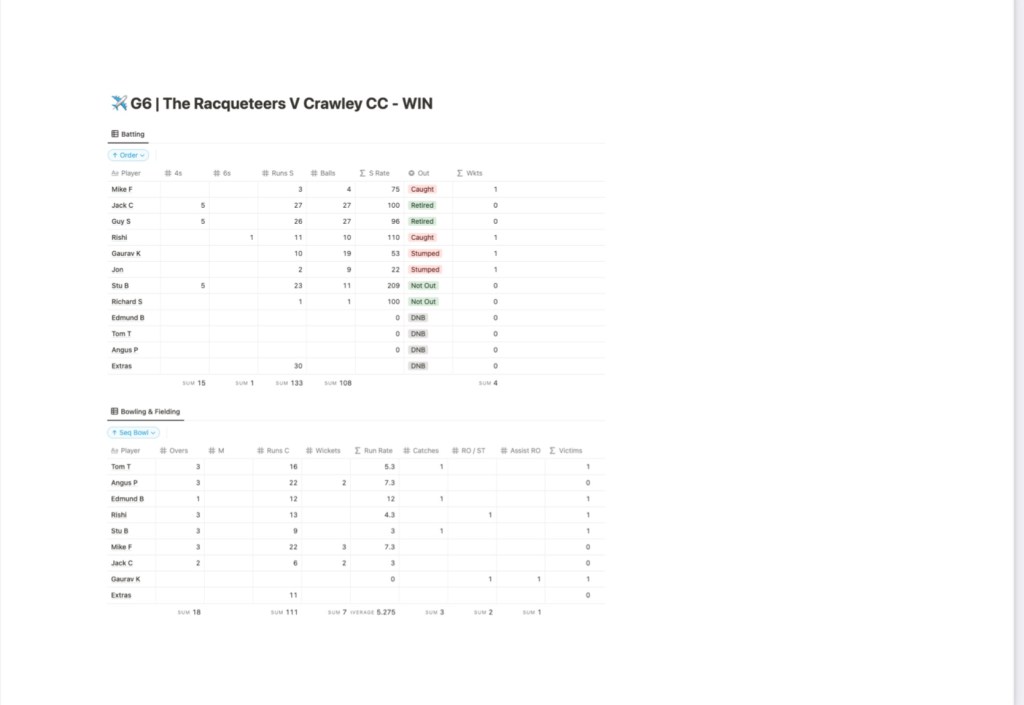This was real all-round team performance with excellent batting, bowling and some superb fielding – three excellent catches (Ted Talks, Sepia and Stu – and no drops) and a well executed stumping (G). Worthy of particular note was some wonder fielding by Rishi on the deep cover boundary – especially the run-out of the Crows’ number 3 – a wonderfully athletic chase, a smooth as Claire’s clotted cream pick-up and a fast flat throw right over the bails for G to finish it off with aplomb!