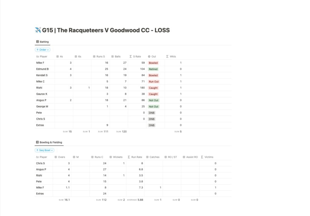 Despite this, The Racqueteers, ever enthusiastic, battled manfully to contain the excellent Goodwood top order. Danger (0-27) bowled jaffas, Chris (1-22) wobbled it around a lot, Rishi (1-14), more frugal than his namesake, combined economy and pace, and Mike (0-8) probed guilefully. Even with a very tidy spell from our second guest, the excellent Pete (0-15), our predictions turned out to be accurate and Goodwood cantered home with 4 overs to spare.